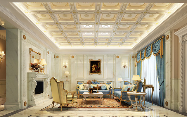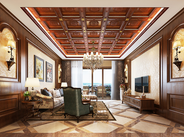 美式古典風(fēng)酒紅色的深沉質(zhì)感,散發(fā)著迷人而成熟神秘的魅力。燈光帶與橫梁架構(gòu)交錯衍生,帶來熠熠璀璨的視覺享受,多層次的躍層效果是整個頂部更加古典優(yōu)雅,仿佛置身于中世紀(jì)的羅馬時代。